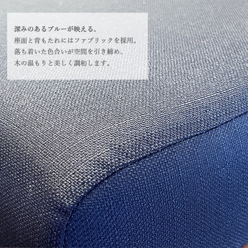 ナチュラルな木目と落ち着いたブルーのファブリックが調和し、