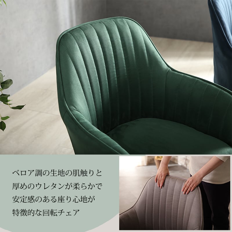 ベロア調の生地の肌触りと厚めのウレタンが柔らかで安定感のある座り心地が特徴的な回転チェアチェア